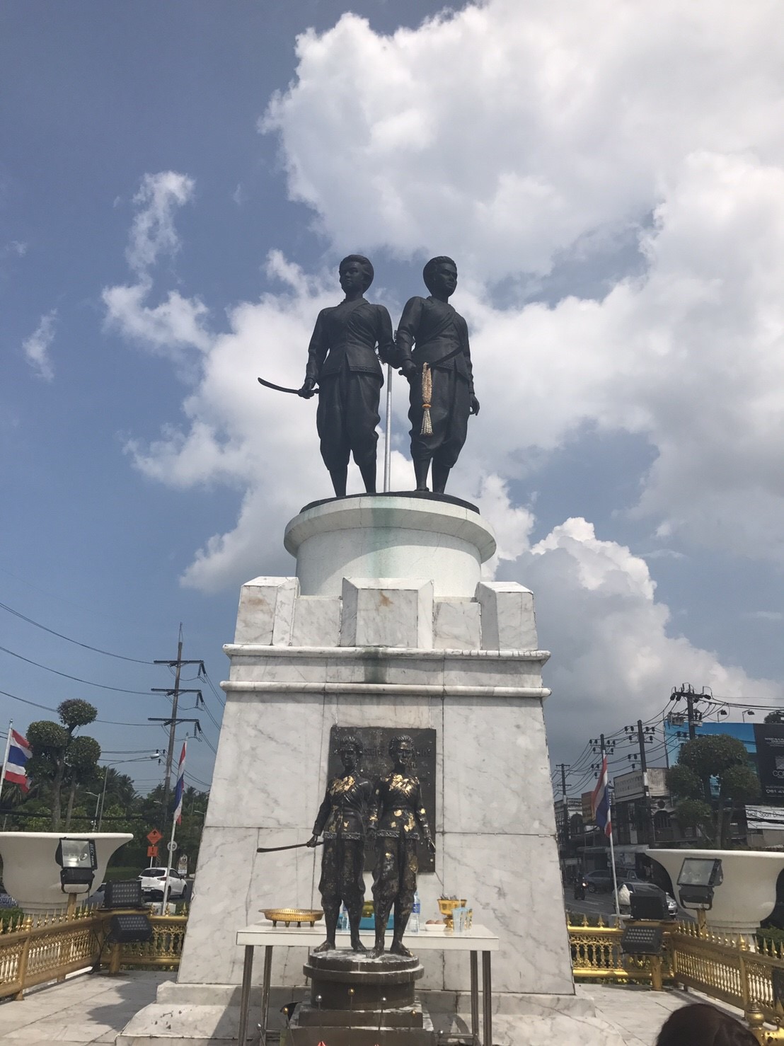 ไปกันต่อที่ อนุสาวรีย์ท้าวเทพกระษัตรีและท้าวศรีสุนทร ตรงข้ามจะมีร้านขายพวงมาลัยและดอกไม้ธูปเทียนแวะอุดหนุนได้ค่ะ แต่เนื่องจากอนุสาวรีย์อยู่ตรงเกาะกลาง การข้ามถนนค่อนข้างลำบาก ก็หาจังหวะเหมาะๆนะคะ ระวังรถด้วยค่ะ