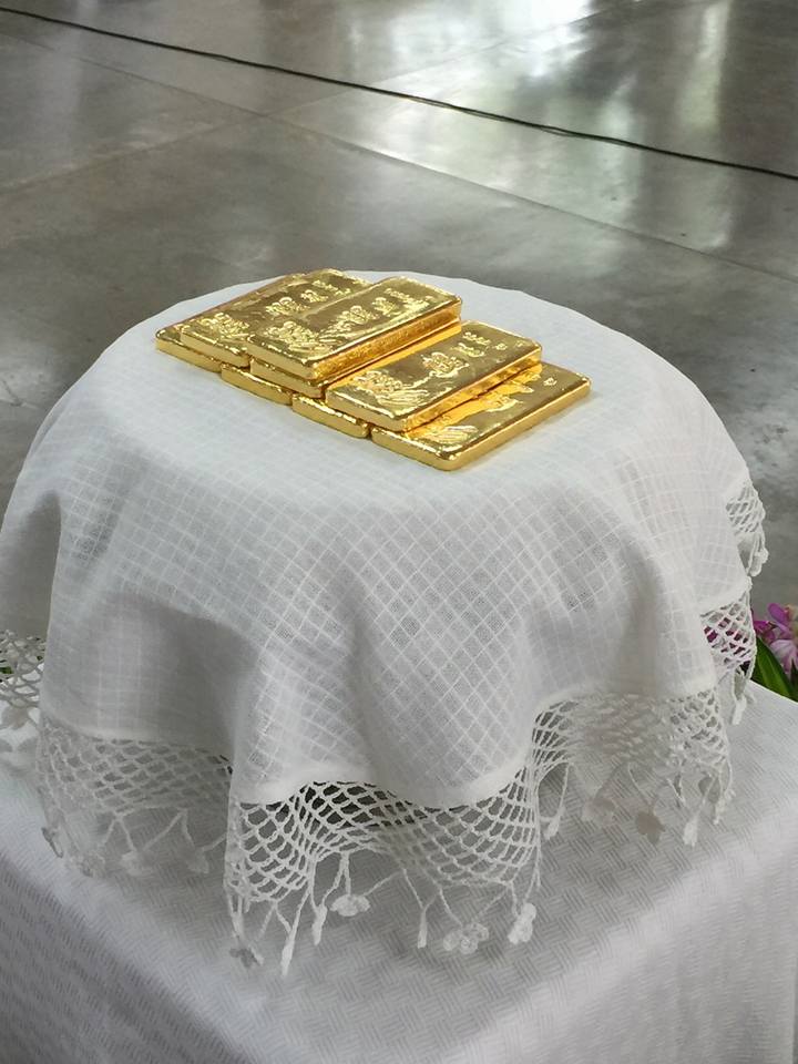 ๑๔.๐๐ น. คณะสงฆ์ในนามคณะศิษยานุศิษย์องค์หลวงตาทุกสารทิศ นำทองคำแท่งที่แปรรูปจากปัจจัยบริจาคในงานบุญประเพณี ๑๒ เมษาฯ