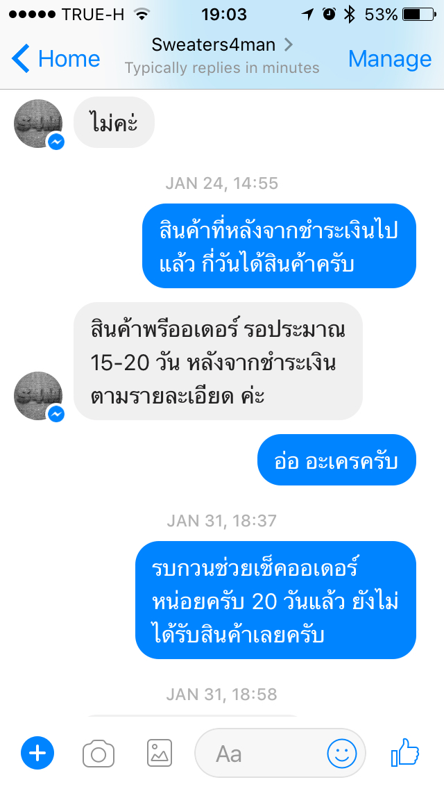 ขอเริ่มก่อนเลยว่า ผมสั่งซื้อกางเกงแบบพรีออเดอร์จากร้านนี้ 2 ตัวครับ ก็ได้สอบถาม,โอนเงินตามขั้นตอนกันไป ทางแอดมินเพจ (หรือนกขุนทองก็ไม่รู้แ-่ง) ก็แจ้งมาว่าสินค้าจะได้รับภายใน 15-20 วันหลังจากชำระเงิน ผมก็โอเคตามนั้น