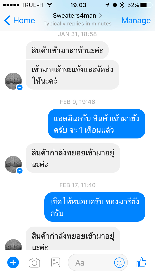 พอครบ 20 วัน ก็ลองถามๆดู ไม่ได้รีบนะ แต่ถ้ามาแล้วก็จะได้เตรียมไปรับที่นิติบุคคล ทางเพจเค้าก็แจ้งมาว่าสินค้ามาล่าช้าตามภาพ เราก็โอเคๆ