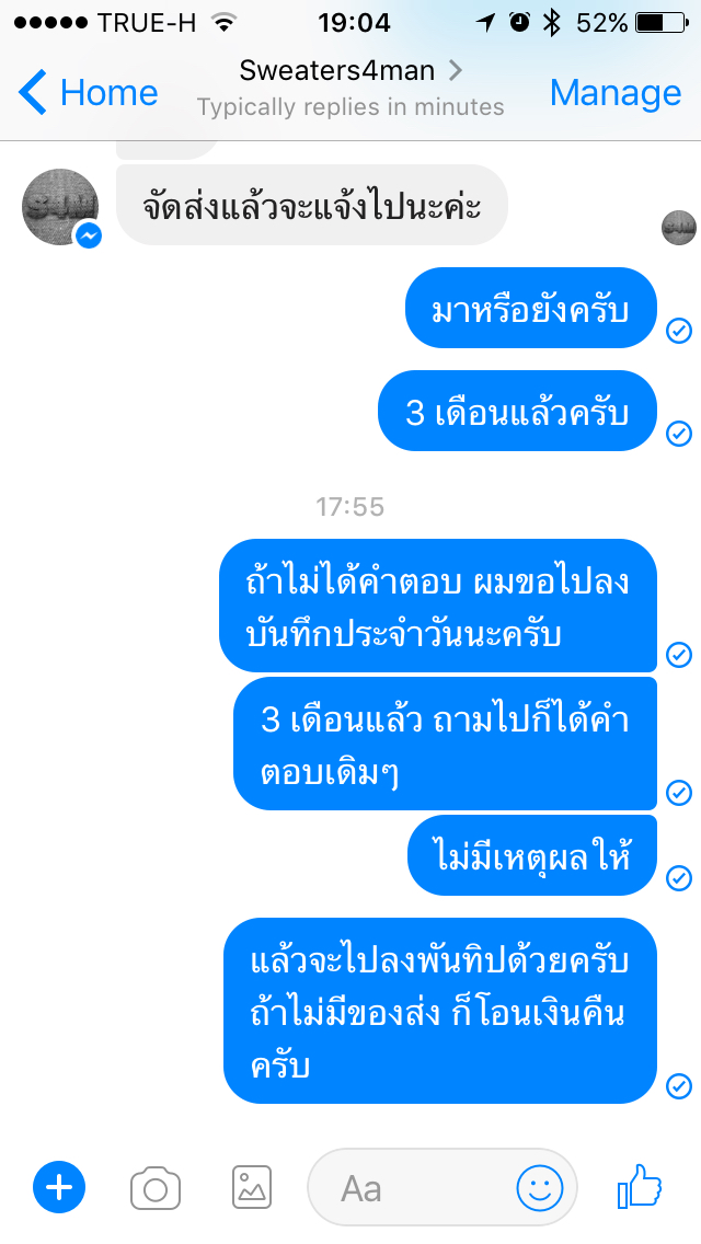 ปล. ใครเคยโดนกับตัวมาแชร์กันได้ครับ ผมก็อยากรู้ว่าทางร้านมาแนวไหน เพราะผมเพิ่งเคยสั่งสินค้าจากเค้าครั้งแรก และผมใจเย็นมากที่รอมาถึง 3 เดือน และเราก็ไม่ได้รีบอะไร แต่เพราะมันนานเกินไปครับ สำหรับสินค้าพรีออเดอร์ จึงสงสัยว่ามันคือกลโกงหรือสินค้ามันยังไม่มากันแน่