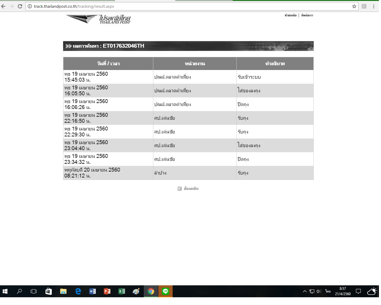 พอดีผมสั่งของชิ้นนึงจาก เชียงใหม่ ผมอยู่ลำปาง ส่ง EMS เมื่อวันพุธ ผมลองเช็คของผ่าน website ของไปรษณีย์ ปรากฎว่า ต้องไปเข้าศูนย์ไปรษณีย์ที่เด่นชัย จ.แพร่ก่อน แล้วถึงย้อนกลับมาลำปาง ทำไมถึงไม่ลงที่ลำปางก่อนแล้วค่อยไปที่เด่นชัยอ่ะครับ งงเด้