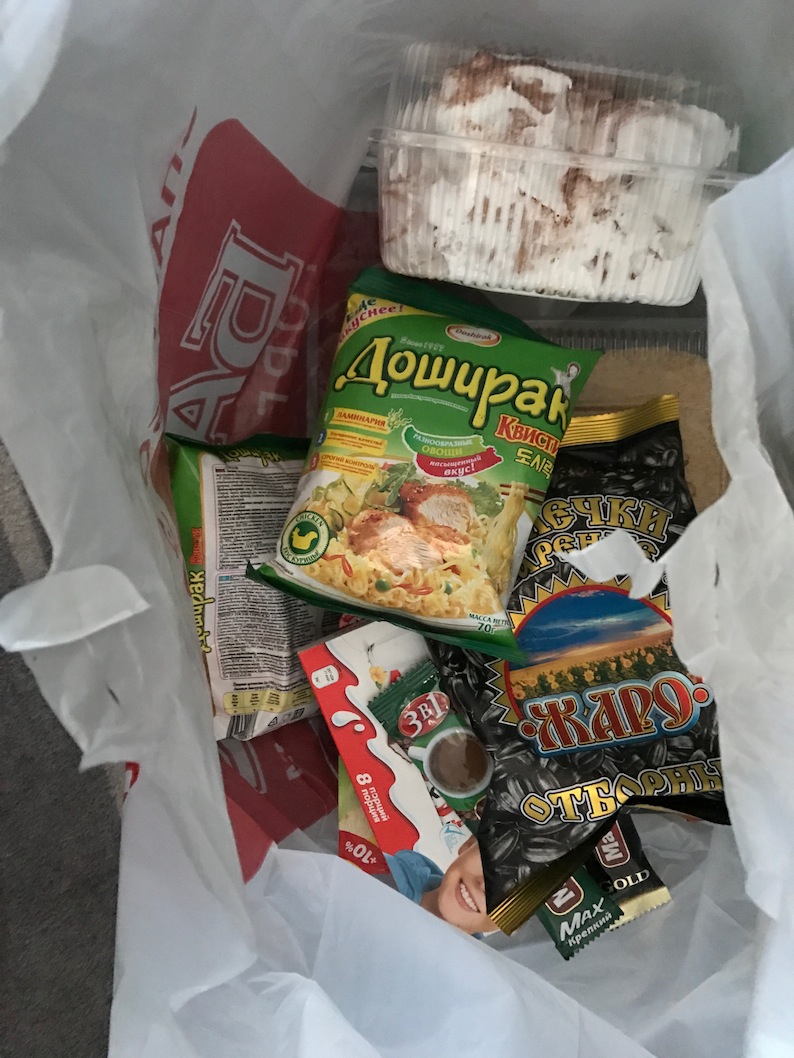 เสบียงใกล้หมด พวกเราก็เดินมั่วๆในสถานี ซึ่งเป็นสถานีชานเมือง เงียบๆไม่มีใครพูดภาษาอังกฤษเลย หนาวก็หนาว ลมก็แรง ก็เลยเดินทะลุออกมาที่จอดรถ มองไปทางขวาเห็นกระท่อมเล็กๆ เดินไปตามความรู้สึก แม่เจ้าดีใจสุดซึ้ง ร้านขายของกินนี่เอง ชี้ๆมั่วๆคุยภาษาใบ้ได้ขนมปัง 2 กล่อง โยเกิร์ต มาม่า ชอคโกแลต รวม 781 รูเบิล