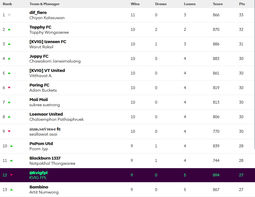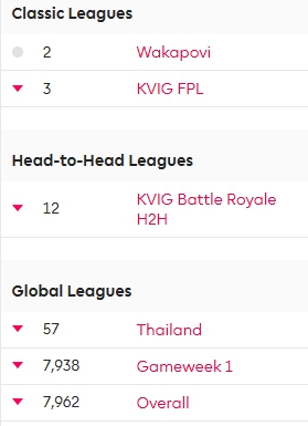 ใน KVIG H2H ibra ยังทำให้เราแพ้ไป 58-54 น่าเสียดายอย่างยิ่ง อันดับเราตกไปอยู่อันดับที่ 12 ทำให้โอกาสของเราลดน้อยลง เพราะเหลือการแข่งขันรอบแรกเพียง 2 GW เท่านั้น โดย Top 8 หลังจบ GW35 จะได้เข้าแข่งต่อในรอบ knock out ในช่วง GW36-38