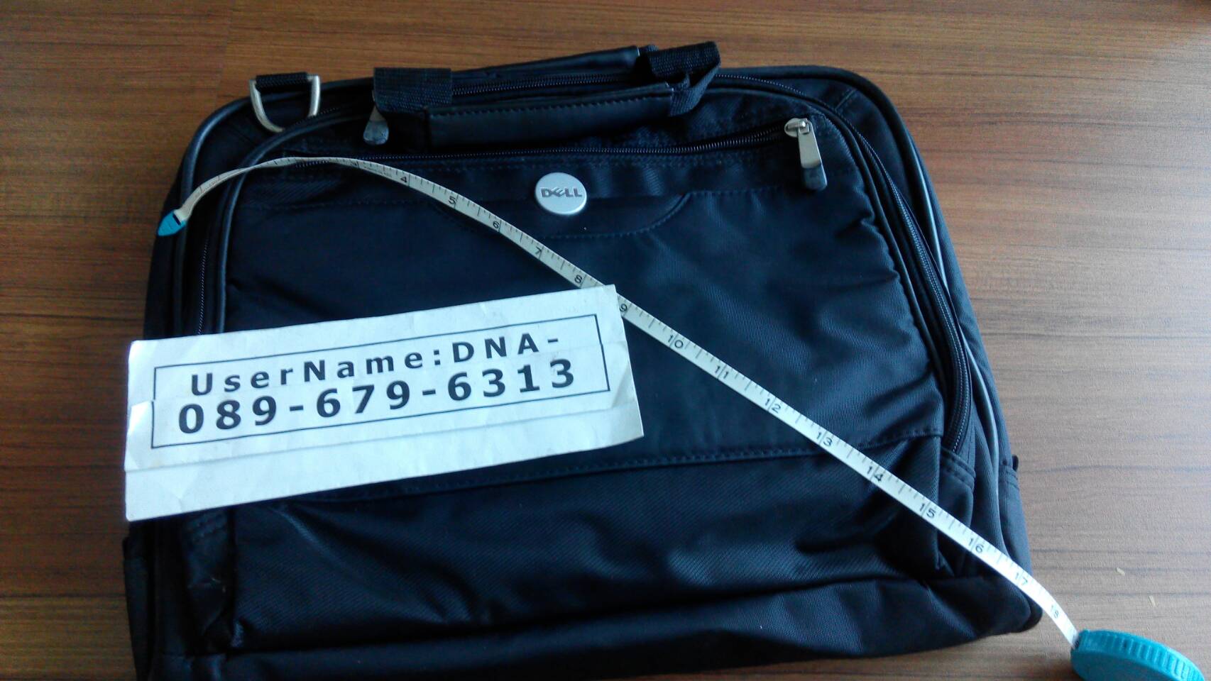 B: กระเป๋าโน๊ตบุ๊ค DELL เก่าเก็บ มียางที่หัวซิปเริ่มเสื่อม ขนาดแทยงมุม 17นิ้ว กว้าง 14.5นิ้ว มีสายสะพายยังไม่ได้แกะออก สูง 11นิ้ว