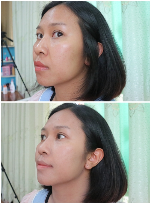 รูปบนก่อนทาและรูปล่างหลังทา เห็นได้ชัดเลยว่าผิวสว่างขึ้นและช่วยลดรอยแดงตรงแก้มได้ดีพอสมควร ใช้แทนรองพื้นสำหรับวันที่อยากแต่งหน้าเบาๆใสๆได้เลยค่ะ
