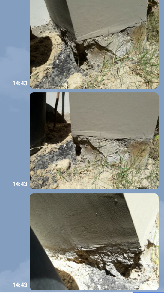 ฐานเสาคู่ตรงโรงจอดรถ พอดินทรุดเลยเห็นว่าฐานเสาบิ่นเนื้อเสาหายไปส่วยหนึ่ง และพอเอาไม้ไปจิ้มๆ ก็เป็นผงหลุดร่วงออกมา แบบนี้อันตรายไหม หรือเป็นปัญหาโครงสร้างหรือไม่ จะแก้ไขอย่างไร รบกวนขอคำแนะนำด้วยค่ะ (บ้านสร้างเสร็จปี 2558)