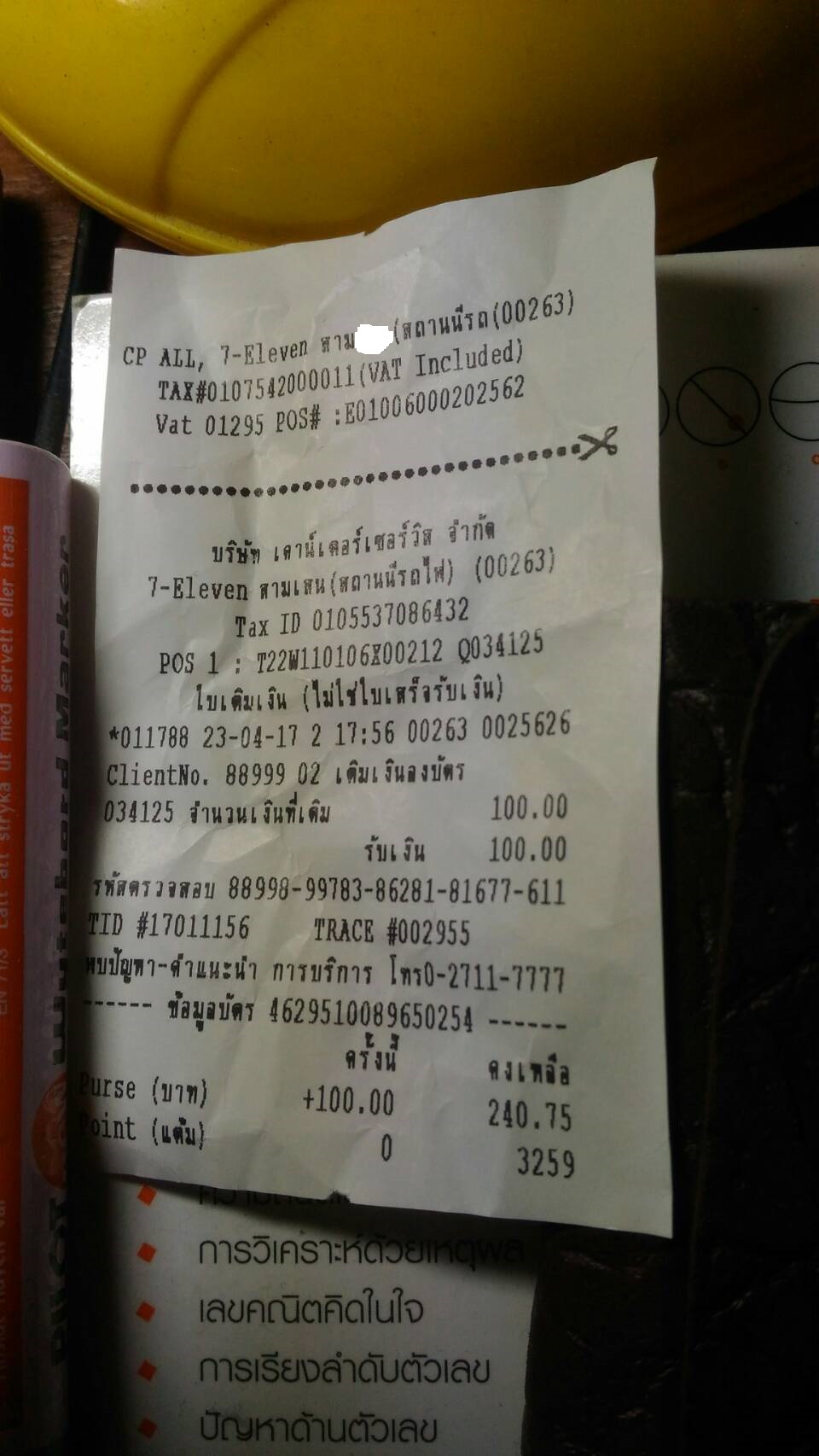 เหตุเกิดเมื่อวันที่ 23 เม.ย. 2560 เวลา หกโมงเย็น ครับ ผมและแฟน ได้ไปใช้บริการเซเว่นแห่งหนึ่งแถวสถานีรถไฟแห่งหนึ่งขึ้นต้นด้วย "สาม" ในจังหวัดกรุงเทพฯ ผมใช้บริการที่นี่บ่อยมากครับแต่ไม่เคยเจอเหตุการณ์แบบนี้เลยครับ เรื่องมีอยู่ว่าผมกับแฟน เข้าไปซื้อของตามปกติ แฟนผมก็เดินเลือกซื้อสินค้า ตัวผมก็เดินไปเช็คยอดเงินในบัตรที่เคาเตอร์ตอนนั้นเงินในบัตรมีอยู่ 40.-บาทโดยประมาณ ผมก็เติมเงินในบัตรเข้าไป 100.-บาท โดยยื่นแบงค์ 1,000 ไปให้ ผมเป็นคนค่อนข้างละเอียดครับให้ 1,000 ทอน 900 ยอดขึ้นในบ้ตร 140.- ปกติครับเช็คดูบิลเรียบร้อยครับ จากนั้นแฟนผมก็ช๊อปของเสร็จ เตรียมชำระเงินผมและแฟนเข้าไปที่เคาเตอร์ 1 ครับ ถ้าใครเคยไปที่นี่ก็เคาเตอร์ขวามือสุด ผนักงานยิงบาร์โค๊ดปกติครับ สรุปยอดเงินหลังหักจากสิทธิ์แลกซื้อไป 6 สิทธิ์แลกซื้อครับ เรียบร้อยปกติดี ถึงเวลาชำระเงินครับ ยอดรวมของที่ต้องชำระอยู่ที่ 185.- บาทครับ เงินไม่พอครับ แฟนผมเลย ยืน แบงค์ ....... ให้ผนักงานไป และบอกด้วยว่า "เติมบัตร100.-บาทค่ะ" ส่วนตัวผมก็มีหน้าที่แตะบัตรอย่างเดียวครับ แตะเติมเงิน"ติ๊ด" แตะจ่ายของ"ติ๊ด" แล้วผมก็ เช็คเงินคงเหลือ บัตร โอเคตรงครับ 55.- บาทยังเหลือ แฟนก็ทักครับว่า ดูใบเสร้จหน่อยสิ!! ผนักงานคิดถูกมั้ยตั้ง 6 สิทธิ์ ดูใบเสร็จครับตรงทุกอย่าง โอเคกลับบ้าน+++++