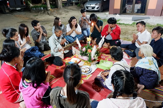 พอบายศรีสู่ขวัญเสร็จ และในที่สุดก็มาถึงเวลาที่พวกเรารอคอย คือการรับประทานอาหารแลง(อาหารเย็นนน) มัวแต่กินไม่ได้ถ่ายรูปไว้เลย นี่คืออาหารเย็นของพวกเราจ้า