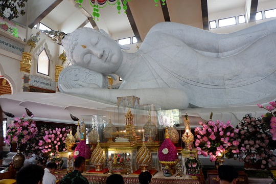 ภาพนี้จะเป็นภาพ พระพุทธไสยาสน์โลกนาถศาสดามหามุนี เป็นพระพุทธรูปปางปรินิพพาน ทำด้วยหินอ่อนขาวจากเมืองคาร์ราร่า ประเทศอิตาลี ความยาว 20 เมตร มี ลักษณะอ่อนช้องดงงามงาม
