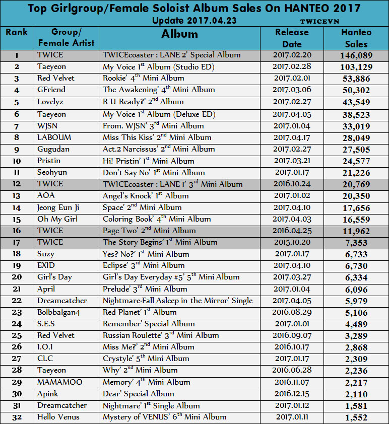 [K-POP] Update ยอดขายอัลบั้ม Girl Groups + Solo หญิง ปี 2017 [Hanteo]