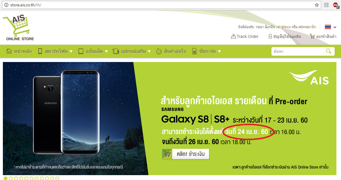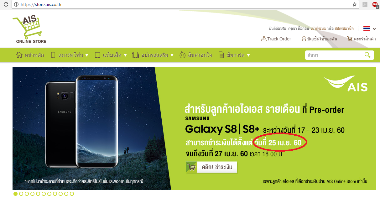 ผม Pre-Order Samsung galaxy S8 จาก www.galaxyunboxyourphone.com แล้วเลือกจ่ายที่ AIS Online Store ผมเข้าไปในเว็ป Online Store ไม่เห็นมีที่ให้กดจ่ายเงินเลย มีแบนเนอร์ให้กดจ่ายเงินที่นี่แต่คลิ้กไม่ได้ พ