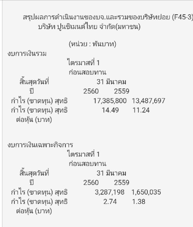 ผลการดำเนินงาน บริษัท ปูนซิเมนต์ไทย จำกัด(มหาชน) งวดปี2560 ก่อนสอบทาน (งวดไตรมาส4/2560 รวมอยู่รูปในด่านล่าง ) สรุปหยาบๆคือ ในปี60 รายได้เพิ่ม6% แต่กำไรลด2% เมื่อเทียบกับปี59 รายละเอียดคร่าวๆข
