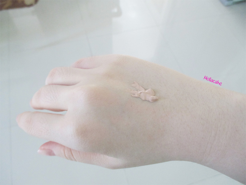 ปาดบนหลังมือก่อน~ ตัวบีบีครีมเป็นสีเนื้อ ไม่เหนียว แต่รู้สึกได้ถึงความเข้มข้น กลิ่นหอมกันแดดอ่อนๆ เหมือนครีมกันแดดยี่ห้อหนึ่ง ที่เราจะทาบ่อยๆ ตอนว่ายน้ำค่ะ
