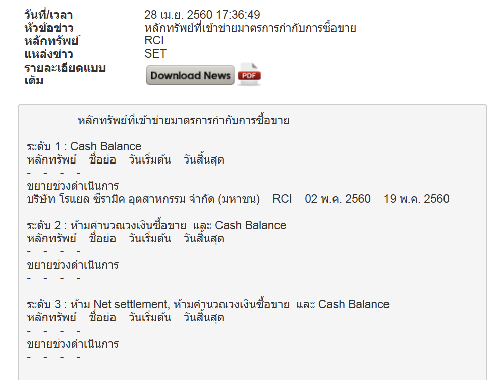 CASH BALANCE : ตลท ประกาศหลังปิดตลาด 26/5/2560