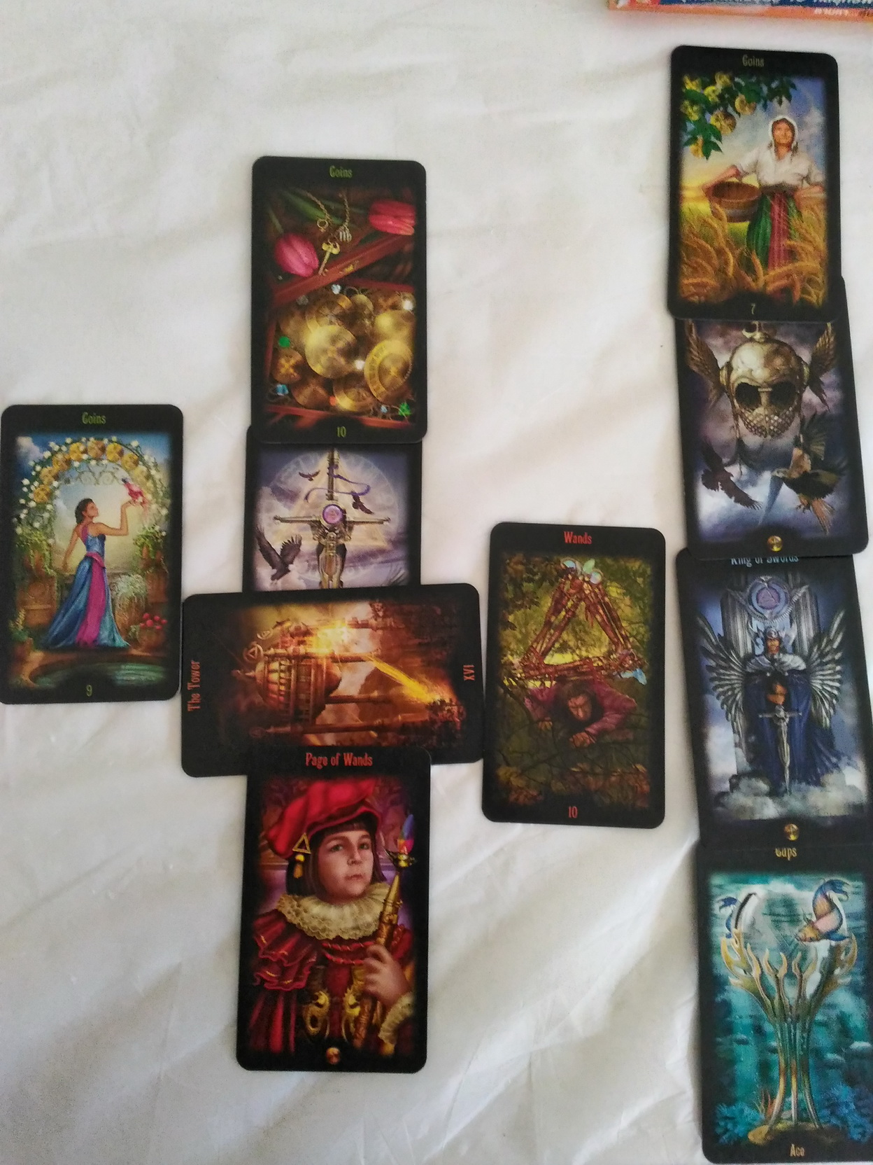 ผมจะขอฝึกการอ่านไพ่ไปด้วย เท่าที่ผมดูหน้าไพ่ ผมเห็นการเริ่มต้นสิ่งใหม่ๆ ทาวเวอร์ผมรู้สึกถึงสิ่งที่ไม่ดีกำลังจะพังทลายหายไป 9 และ 10 เหรียญได้แต่ยิ้มแต่อ่านไม่ออก ฮ่าๆ
