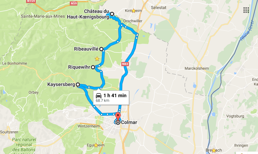 วันนี้ (1 เมษายน 2560) ตามโปรแกรมที่วางไว้ ตั้งใจว่าจะขับรถไปตามเมืองเล็กๆ ที่ตั้งอยู่ในหุบเขาที่มีการปลูกองุ่นเพื่อใช้ทำไวน์ วิ่งไปตามเส้นทางที่เรียกว่า “The Alsace Wine Route” หรือ “Route des vins” เมืองที่จะแวะเที่ยวในวันนี้ก็คือ Ribeauville, Riquewihr, Kaysersberg และ Equisheim แต่เมื่อวานตอนทานพิซซ่าพนักงานในร้านพิซซ่าได้พูดถึงปราสาท Chateau de Haut-Koenigsbourg ซึ่งอยู่บนยอดเขาใน Orschwiller ที่เราผ่านมาแล้วแต่ยังไม่ได้แวะ เช้านี้จึงตีรถย้อนขึ้นเหนือเพื่อไปเที่ยวปราสาทนี้ก่อนเป็นรายการแรก