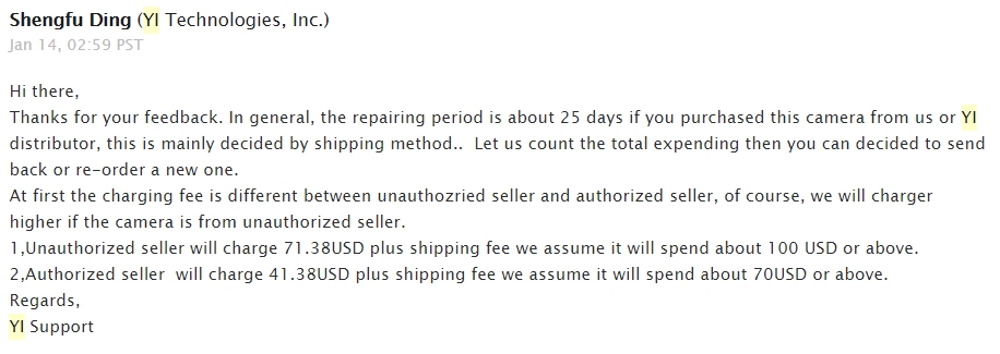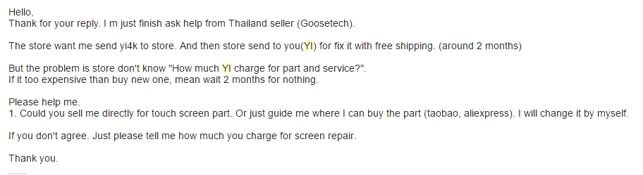 - ติดต่อ yi support จีน ก่อนว่าสามารถหาอะไหล่ได้ที่ไหน ราคาเท่าไหร่ เพราะจะลองซ่อมเอง ถ้าส่งซ่อมเท่าไหร่ บลาๆ