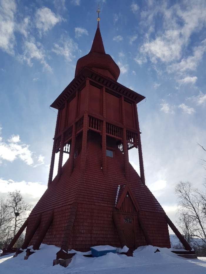 สภาพยานแม่ก่อนร่อนลงจอด เอ้ยย ไม่ใช่ค่ะ หอระฆังนะคะ สวยงามทีเดียว ลักษณะโบสถ์และหอระฆังที่นี่จะคล้ายๆกันค่ะ จะเห็น mini kiruna church ที่ พิพิธภัณฑ์กลางแจ้งซามีอีกที