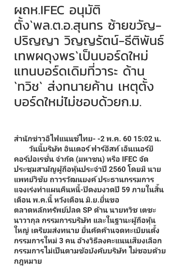 5 เดือนผ่านมาแล้วที่การพิพาทของคน 2 คน คือ วิชัย ถาวรวัฒนยงค์ กับ สิทธิชัย พรทรัพย์อนันต์ ได้ฝากแผลลึกไว้ในใจผู้ถือหุ้น IFEC เป็นค่าตอบแทนความศรัทธาที่เคยมอบให้อย่างสุดซึ้ง ขี่พายุทะลุฟ้า : บูรพา สงว