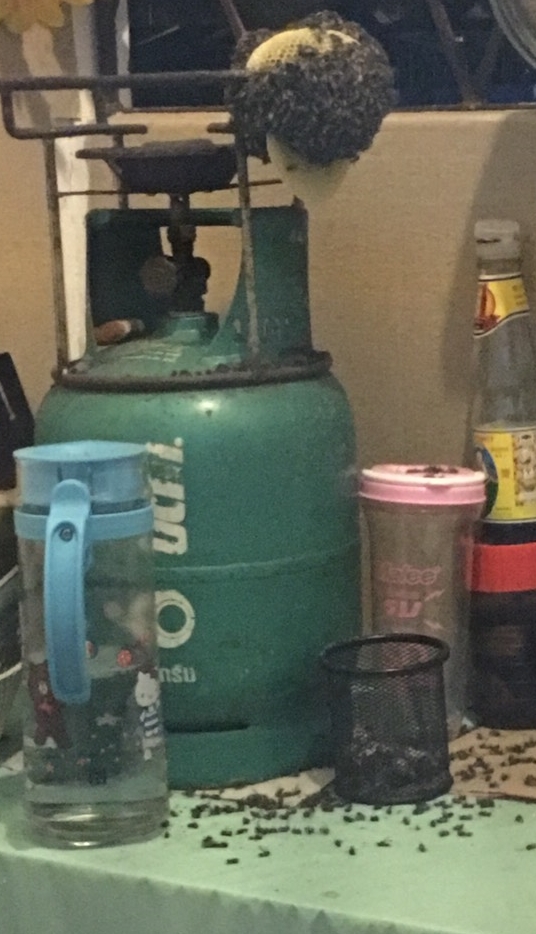 ที่ถ่ายเป็นระเบียงหอพักของผม มีมุ้งลวดกั้นไว้ แต่มันก็ยังบินมา ขนาดแมลงวันบินเข้าห้องผมยังไล่มันเลย แต่นี่ผมฆ่ามันทั้งรังมันจะกลับมาอาฆาตผมไหมครับเนี่ย รอผู้รู้เรื่องการไล่ผึ้งหน่อยครับ