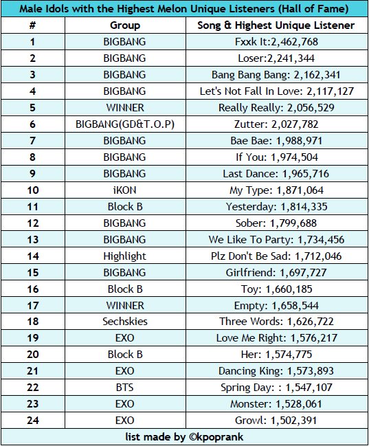 HALL OF FAME (จำนวนผู้ฟัง Unique Listeners ในเมล่อนเกิน 1.5 ล้าน user) Credit : Kpoprank