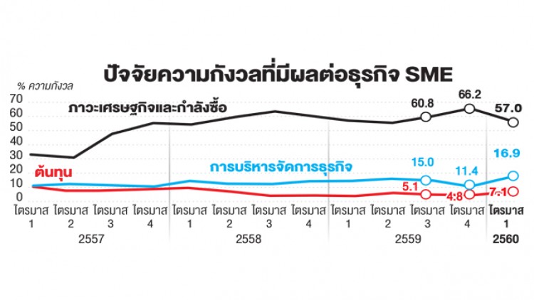 ความเชื่อธุรกิจเอสเอ็มอีไตรมาสแรกปีนี้ ยังทรงตัวในระดับที่ไม่ค่อยแข็งแกร่งนัก ส่วนหนึ่งเป็นผลจากเศรษฐกิจที่ยังไม่ค่อยดี แม้ความกังวลด้านรายได้น้อยลง จากความสามารถด้านยอดขายปรับตัวดีขึ้น แต่กลับมากังวลด้านต้นทุนมากขึ้น สร้างแรงกดดันการบริหารธุรกิจมากกว่าเดิมจากค่าแรงและราคาน้ำมันที่ปรับตัวสูงขึ้นซึ่งเป็นตัวหน่วงธุรกิจเอสเอ็มอี