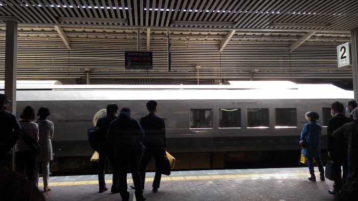 นั่งรอรถไฟเพื่อต่อไป Beppu เพื่อไปงานแต่งพี่สาวของแฟนที่ Suginoi Hotel