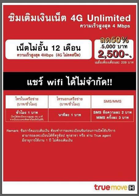 4G/3G/EDGE/GPRS ใช้งานได้อย่างต่อเนื่องไม่จำกัดปริมาณการใช้งานที่ความเร็วสูงสุด 4 Mbps (เมกะบิตต่อวินาที), WiFi ไม่จำกัด ,