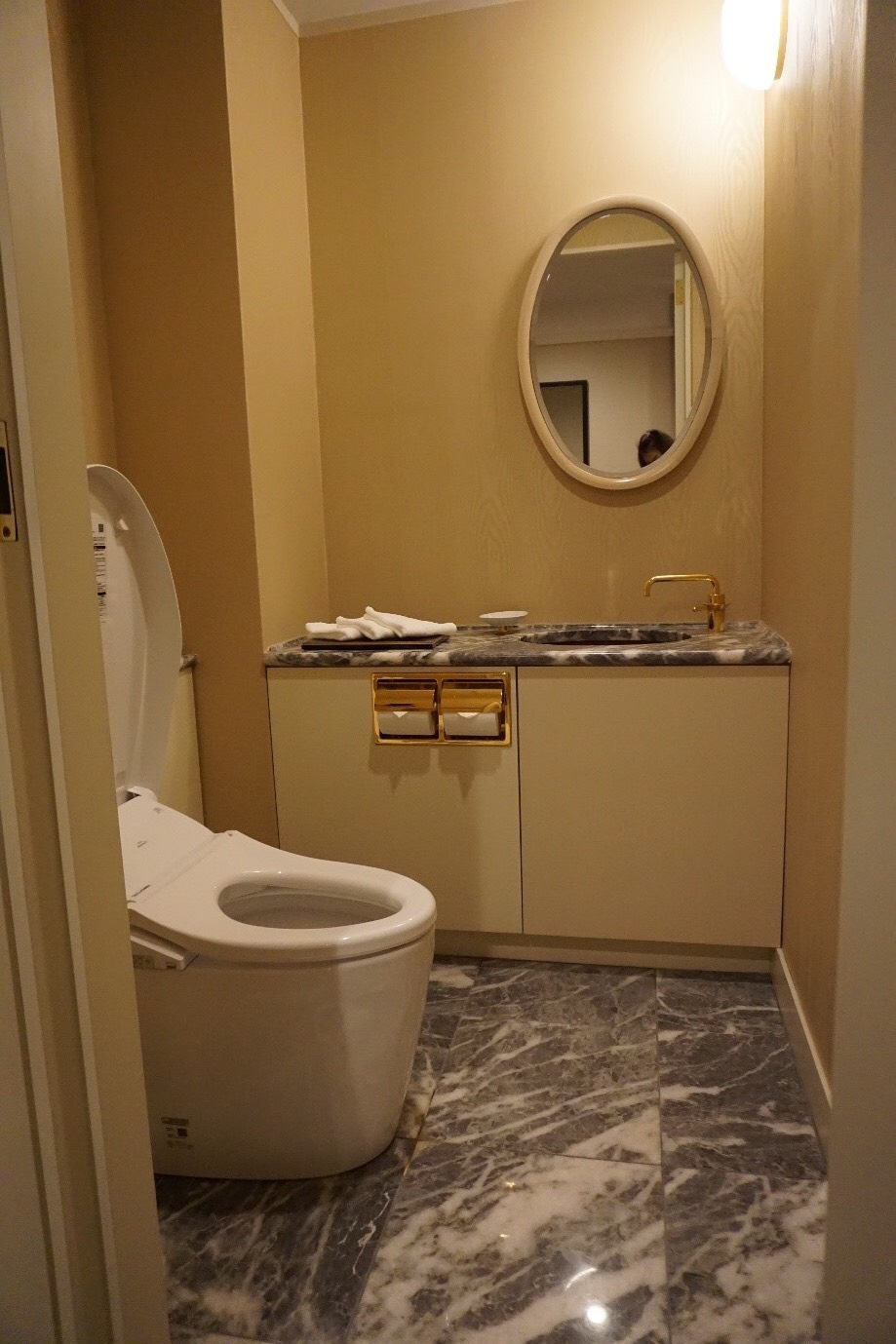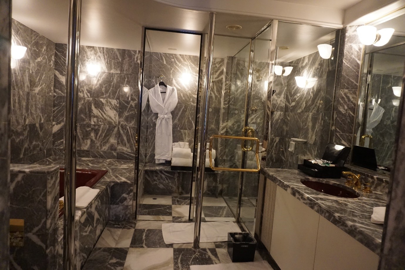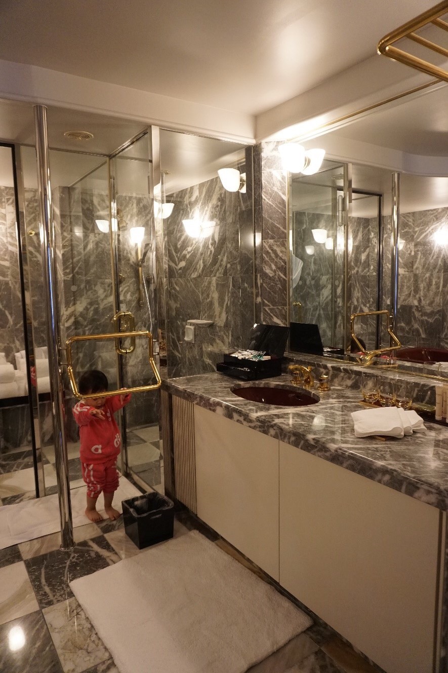 ต่อมาคือห้องที่ทุกคนรอคอย ห้องน้ำค่ะ ห้องน้ำปูด้วยหินอ่อน ประดับประดาด้วยก๊อกน้ำ ที่จับต่างๆเป็นสีทองทั้งหมด ดูหรูหราสุดๆเลยค่ะ