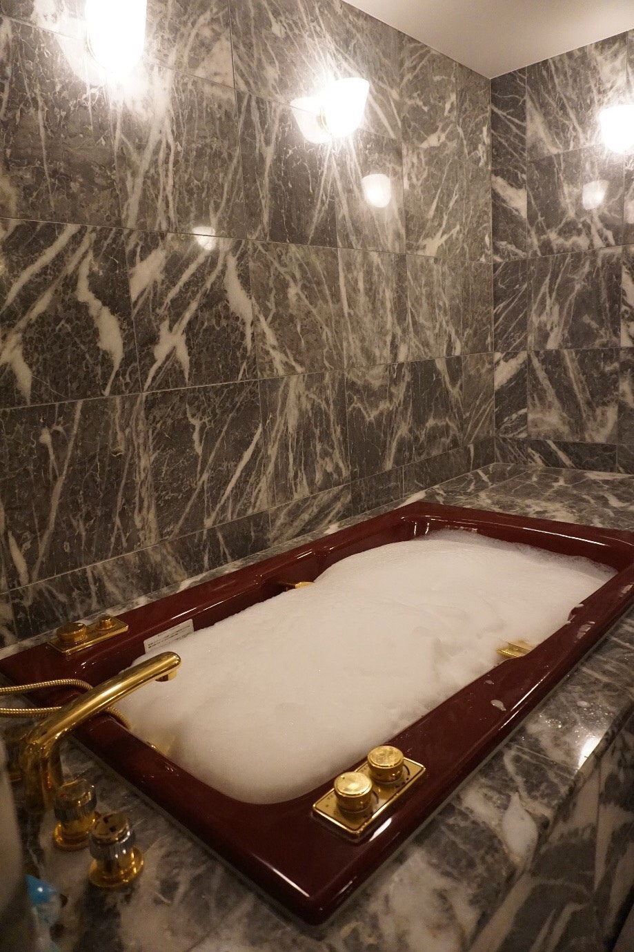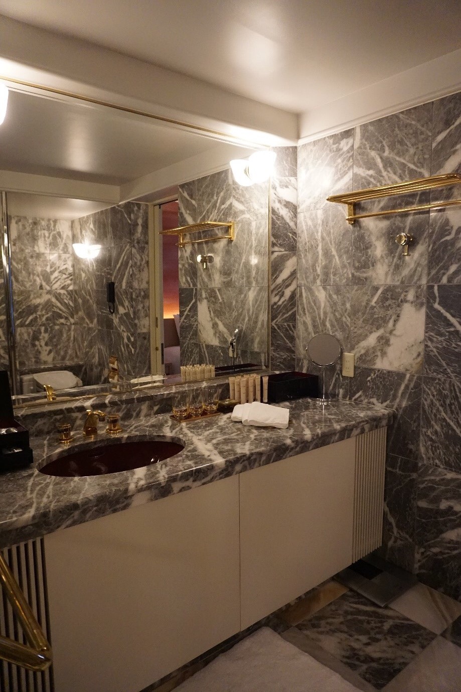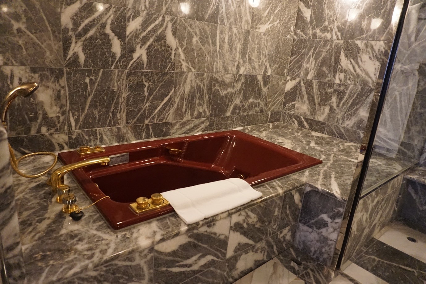 ต่อมาคือห้องที่ทุกคนรอคอย ห้องน้ำค่ะ ห้องน้ำปูด้วยหินอ่อน ประดับประดาด้วยก๊อกน้ำ ที่จับต่างๆเป็นสีทองทั้งหมด ดูหรูหราสุดๆเลยค่ะ