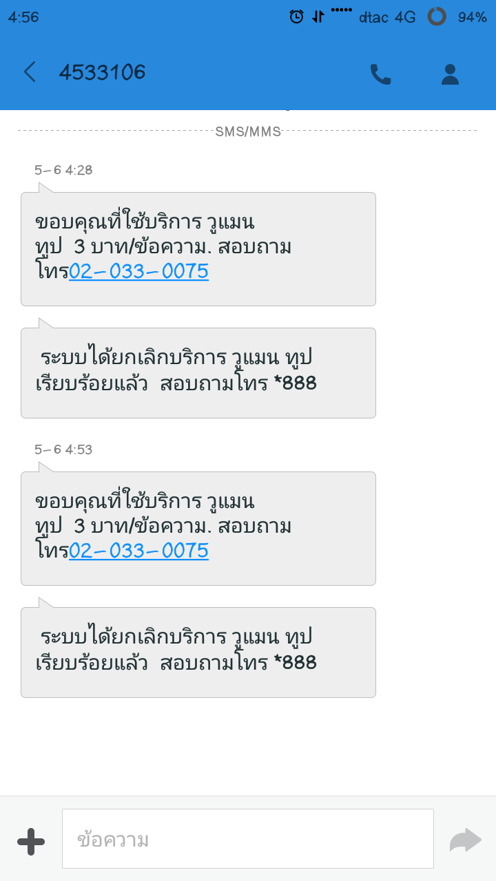 แค่วันนี้วันเดียว มี sms เด้งมารัวๆ ว่าสมัครรับ sms นุ้นนี่นั่น เกือบร้อยกว่าบาทละ ทั้งที่ไม่เคยกดสมัครเลยแม้แต่อันเดียว ทั้งไปยกเลิกในแอพ , ทั้งโทร call center , ทั้งกด*137 เพื่อโทรไปยกเลิก มันก็ยัง