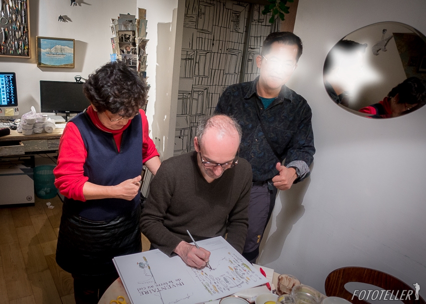 แล้วก็มีการนำของฝากมาให้กัน เพื่อนผมกำลังเซ็นหนังสือที่มีภาพต่างๆ ที่เขาวาดไว้มอบให้เป็นที่ระลึก
