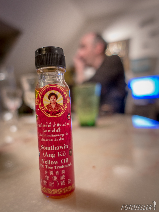 คุยกันถึงเรื่องที่เขาไปเมืองไทยเมื่อปีที่แล้ว เขาหยิบน้ำมันขวดนี้ที่ซื้อจากตราดมาให้ดู . . โอ้ว! นี่มันน้ำมันเหลืองอันเลื่องชื่อของจังหวัดตราด ตราอั้งกี้ (สมถวิล) ที่บินมาถึงปารีสเลยนะ
