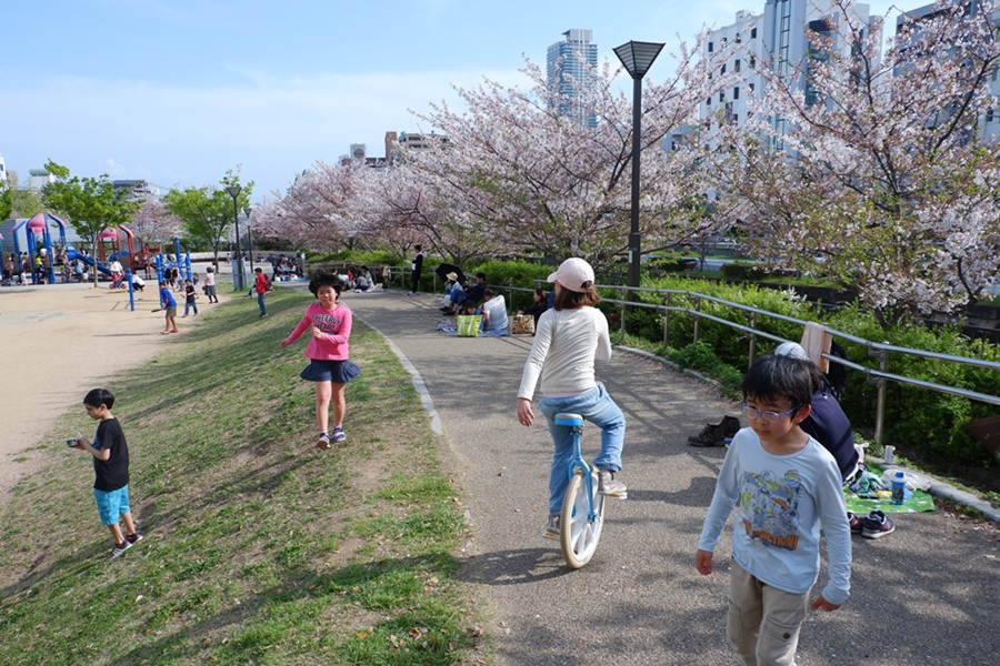 จุดหมายปลายทางต่อไปเมืองโกเบ นั่งรถไฟยาวจาก นารา ไป โกเบ ใช้เวลาประมาณ 1 ชั่วโมง ออกจากสถานี หลงกันนิดหน่อย ไปทางสวนซากุระริมคลองที่ตัดผ่านกลางเมือง มีสนามเด็กเล่น ผู้คนมานั่งปิกนิก จัดเบียร์กันแต่หัววันเลย
