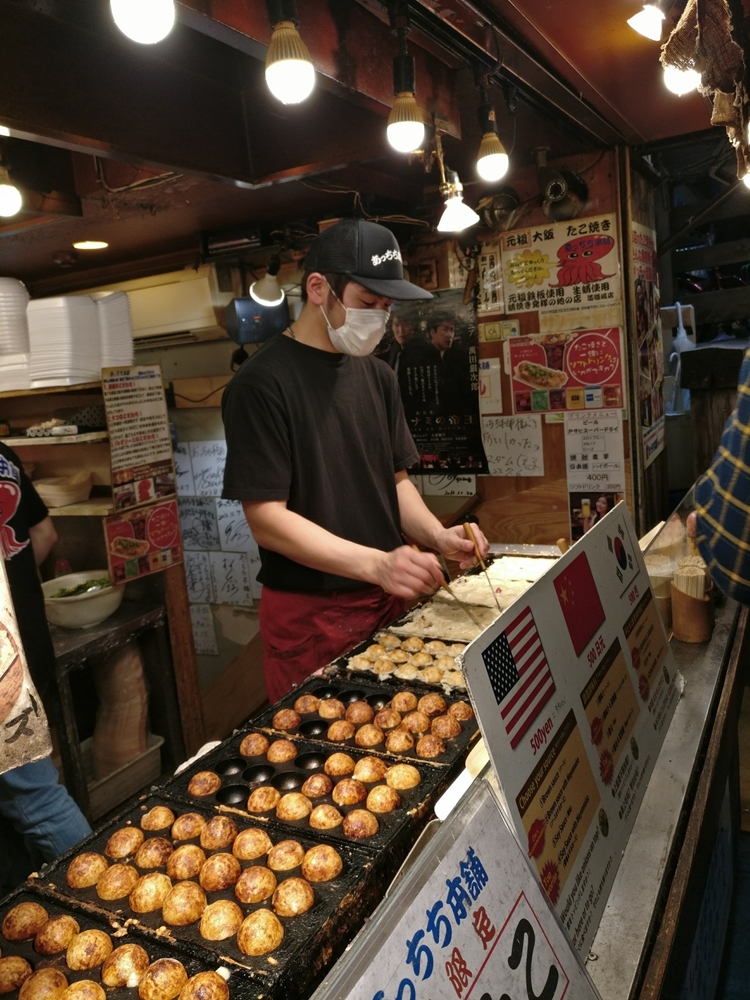 หิวแล้วครับ เราเลือกไปกินทาโกะยากิอาหารขึ้นชื่อเมืองโอซาก้า ซึ่งร้านที่ผมไปต่อคิวซื้อมาเป็นร้านป้ายสีขาว คนต่อคิวเยอะพอสมควร ผมว่าตัวทาโกะมันเละไปหน่อยแต่รสชาติอร่อยใช้ได้ครับ