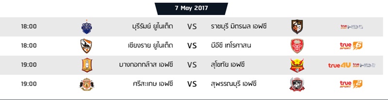 ฟุตบอลไทยลีกวันนี้ นัดที่ 13 ประจำวันอาทิตย์ ที่ 7 พฤษภาคม 2560