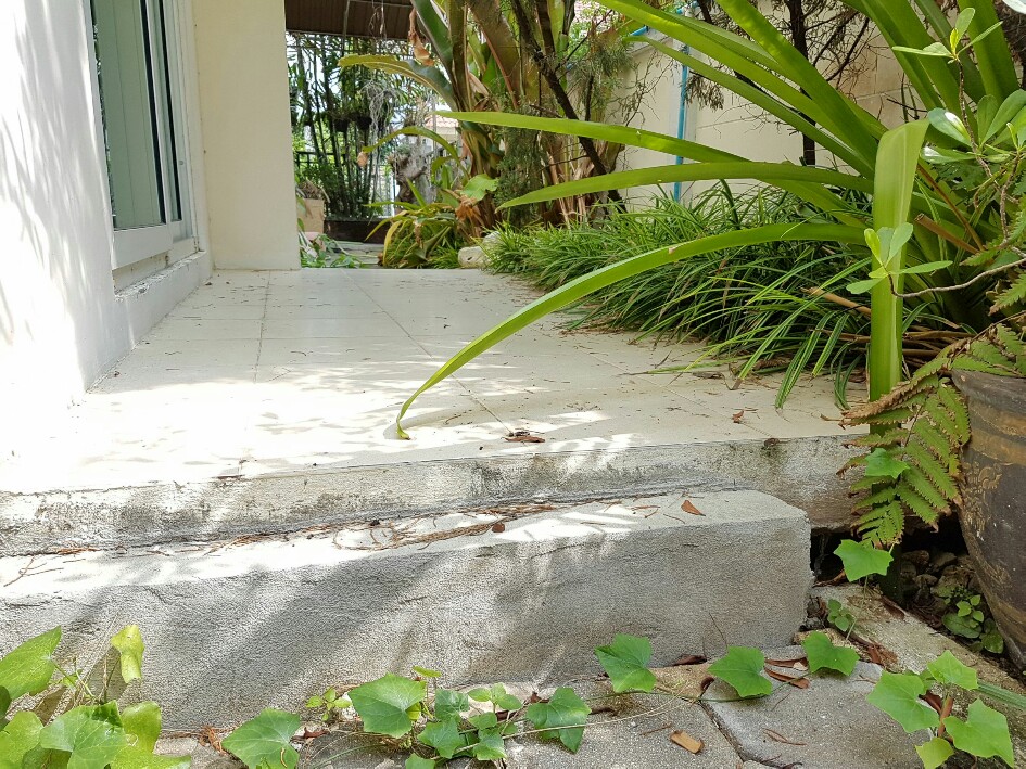 เพราะพื้นปูนด้านนี้ คงไม่มีเสา และเอนลงบ้างแล้วครับ