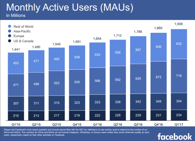ตัวเลขผู้ใช้ที่เข้าใกล้หลัก 2 พันล้านรายเข้าไปทุกทีนั้น คิดเป็นสัดส่วนเพิ่มขึ้น 76 ล้านคนจากไตรมาสที่แล้ว ส่วนใหญ่เป็นการเพิ่มขึ้นในเอเชียแปซิฟิก ซึ่งเป็นพื้นที่ที่เฟซบุ๊กโกยรายได้ไปมากที่สุดเมื่อเทียบกับภูมิภาคอื่น