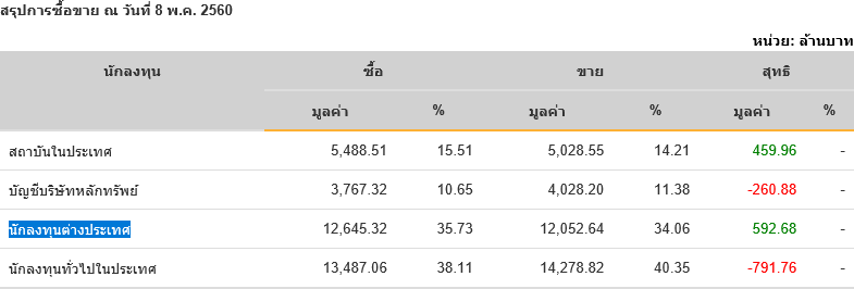 Sinthorn Summary 8/5/2560 : ต่างชาติซื้อสุทธิ 592.68 ลบ.