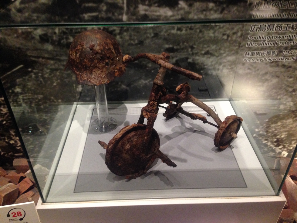 อาคารพิพิธภัณท์สันติภาพฮิโรชิม่า เดินเข้าไปก็เจอภาพถ่ายขนาดใหญ่บนผนัง เป็นภาพหลังระเบิดลงใหม่ๆ คนที่รอดชีวิตเดินมารวมตัวกัน เสื้อผ้าขาด ผิวหนังไหม้ น่าสลดมากครับ แต่ผมไม่ได้ถ่ายภาพนี้มา เอาไว้ไปดูเองล่ะกันครับ และก็มีพวกสิ่งของที่โดนระเบิดพร้อมคำอธิบายครับ ก่อนเข้าอย่าลืม ติดต่อเจ้าหน้าที่ขอหูฟังคำบรรยายภาษาไทยนะครับ ตอนผมไป หูฟังหมด