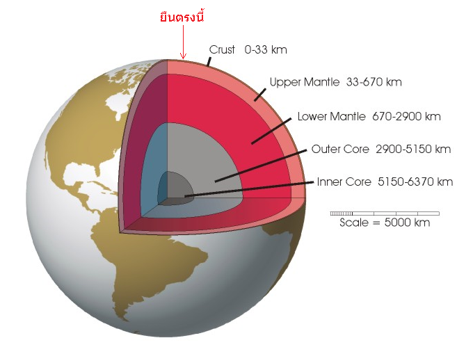 ที่ไกลกว่า 5 - 8 กิโลเมตร ดังนั้น เราก็จะเห็นส่วน crust ซึ่งเป็น ดิน หิน ซาก fossil กลืนกันไปหมดจนมองไม่ชัด