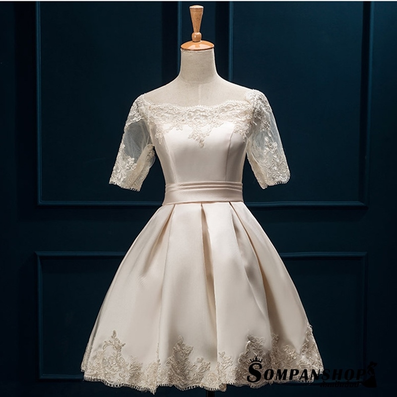 ชุดเดรสออกงานสั้นสีครีมเบจ ผ้าลูกไม้