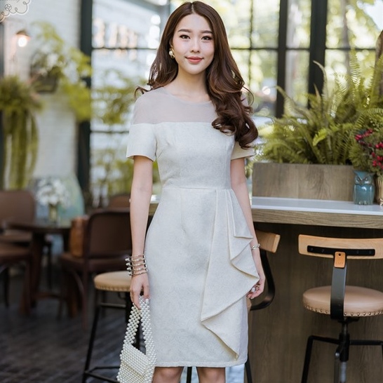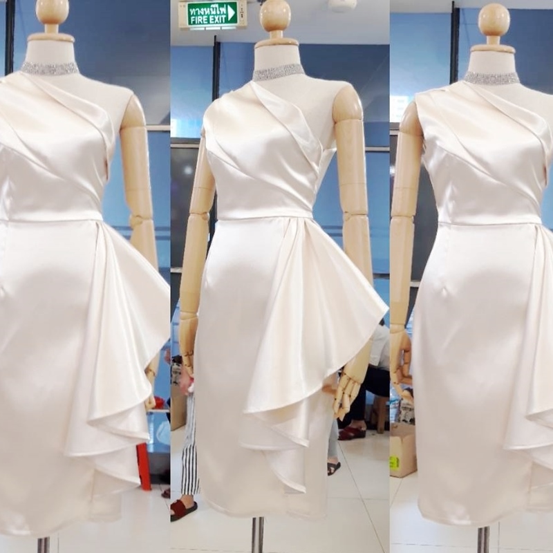ชุดเดรสออกงานสั้นสีครีมเบจงาช้าง