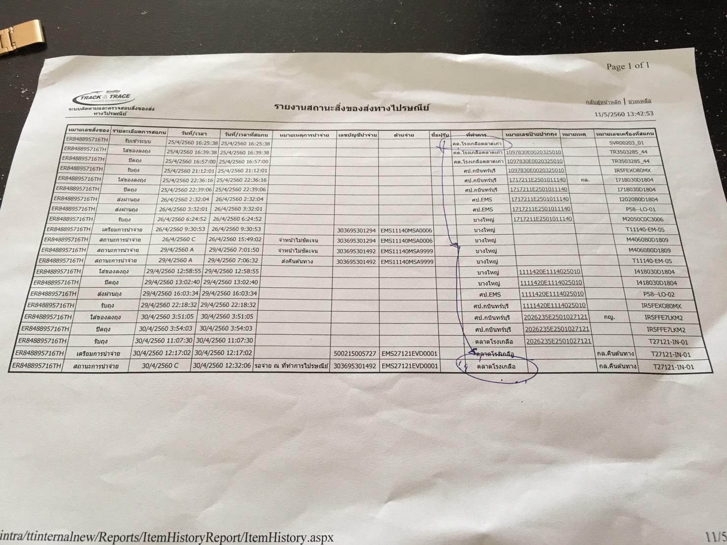 เมื่อวันที่ ... 11/05/60 : ทางผู้ซื้อได้มีโอกาสไปที่ทำการไปรษณีย์ ต้นทาง โดยทาง ปณ. ก็ได้ให้คำตอบเหมือนที่เคยให้มา และไม่สามารถนำของให้ผู้ซื้อได้ เพราะเป็นกฎของทาง ปณ. และทางไปรษณีย์ก็ได้ทำการ พิมพ์ข้อมูลในการเดินทางของพัสดุให้มาแค่นั้น