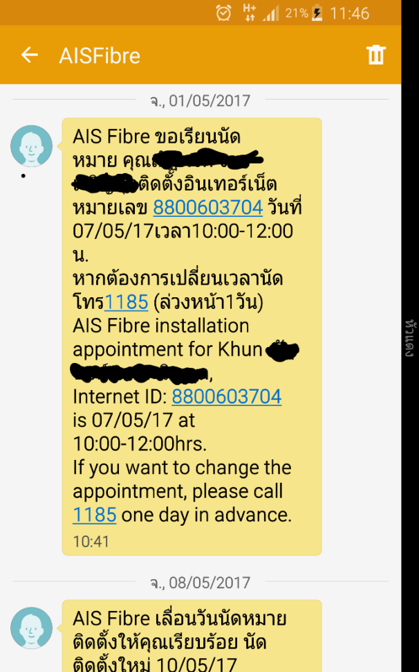 สมัคร Ais Fibre ออนไลน์ทางเน็ต โดยเลือกนัดวันที่ 21 มค 60 เวลา 09.00-12.00 น. เพราะสะดวกวันนี้ครับ ได้รับ sms ยืนวันเวลาดังกล่าวเรียบร้อย โดยข้อความส่งมาเมื่อวันที่ 19 มค 60 เวลา 17.27 น. จนเมื่อกี้นี