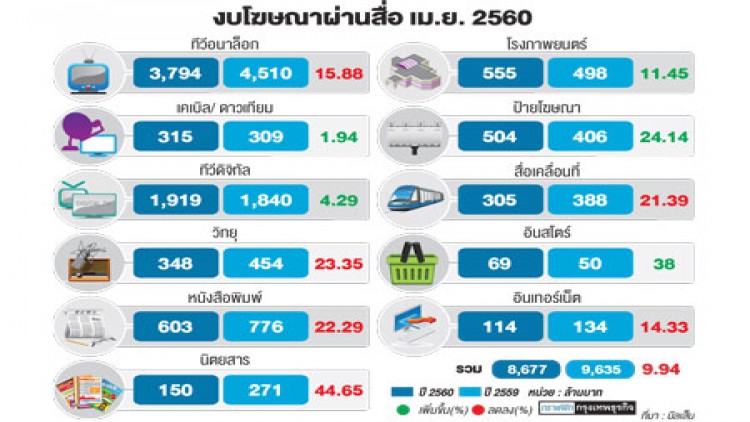 บริษัทนีลเส็น ประเทศไทย จำกัด รายงานมูลค่าการใช้งบโฆษณาผ่านสื่อเดือน เม.ย. 2560 เปรียบเทียบช่วงเดียวกันปีก่อน พบว่า มีมูลค่า 8,677 ล้านบาท ลดลง 9.94%