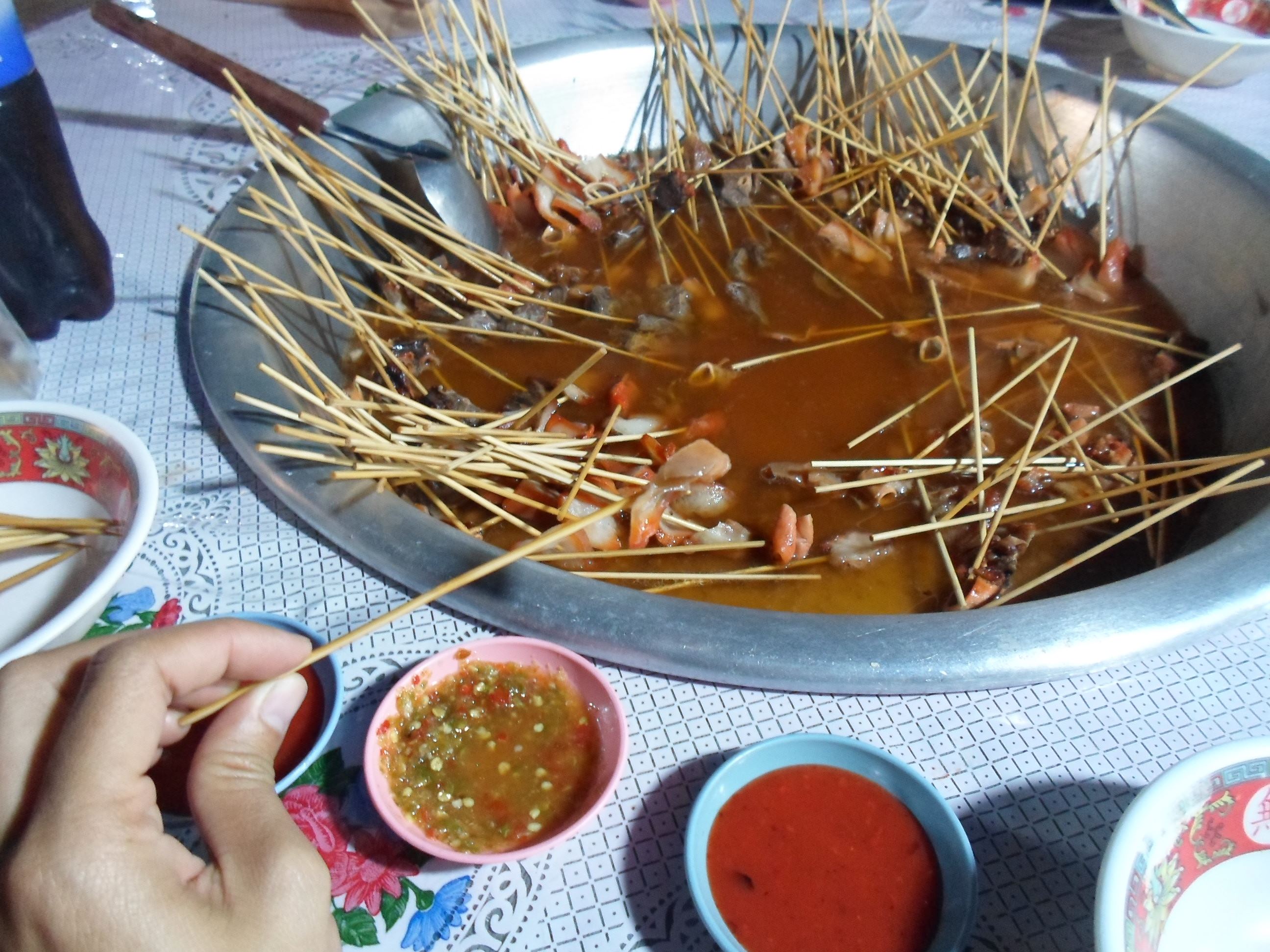 18:00 น. ไปหาของกินที่ตลาด ถนนคนเดินสังขละ ไปกินหมูจุ่มพม่าไม้ละ 1 บาท