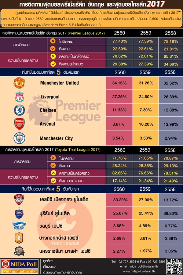 วันที่ 14 พ.ค.60--ศูนย์สำรวจความคิดเห็น “นิด้าโพล” สถาบันบัณฑิตพัฒนบริหารศาสตร์ (นิด้า) เปิดเผยผลสำรวจความคิดเห็นของประชาชน เรื่อง “การติดตามฟุตบอลพรีเมียร์ลีกอังกฤษ และฟุตบอลไทยลีก 2017” ทำการสำรวจระหว่างวันที่ 6 – 9 พฤษภาคม 2560 จากประชาชนทั่วประเทศ กระจายทุกระดับการศึกษาและอาชีพ รวมทั้งสิ้น จำนวน 2,500 หน่วยตัวอย่าง เกี่ยวกับการติดตามฟุตบอลพรีเมียร์ลีกอังกฤษ และฟุตบอลไทยลีก 2017 และทีมที่ชื่นชอบ การสำรวจใช้การสุ่มตัวอย่างด้วยความน่าจะเป็นจากบัญชีรายชื่อฐานข้อมูลตัวอย่างหลัก (Master Sample) ของ “นิด้าโพล” ด้วยวิธีแบบแบ่งชั้นภูมิ (Stratified Random Sampling) โดยแบ่งชั้นภูมิตามภูมิภาค จากนั้นในแต่ละภูมิภาค สุ่มตัวอย่างด้วยวิธีแบบอย่างง่าย (Simple Random Sampling) เก็บข้อมูลด้วยวิธีการสัมภาษณ์ทางโทรศัพท์ โดยกำหนดค่าความเชื่อมั่นที่ ร้อยละ 95.0 และมีค่าความคลาดเคลื่อนมาตรฐาน (Standard Error: S.E.) ไม่เกิน 1.3