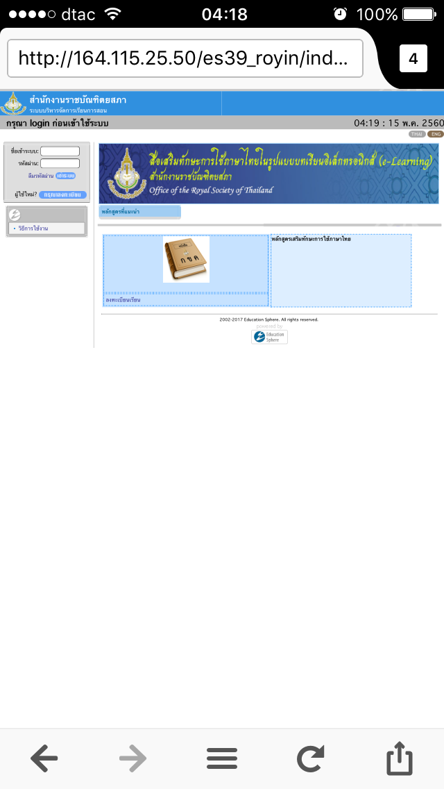 เข้าไประบบ e-Learning นี้ได้ที่ http://www.royin.go.th แล้วเลื่อนหาแถบภาพ e-Learning บทเรียนภาษาไทย ที่เกือบล่างสุดของหน้า ดังภาพ